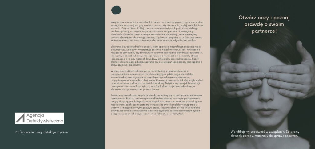 Weryfikacja uczciwości w związkach to jedno z najczęściej powierzanych nam zadań, szczególnie w sytuacjach, gdy w relacji pojawia się niepewność, podejrzenia lub brak zaufania. Często klienci trafiają do nas po wielu miesiącach prób samodzielnego ustalenia prawdy, co zwykle wiąże się ze stresem i napięciem. Nasza agencja podchodzi do takich spraw z pełnym zrozumieniem dla emocji, jakie towarzyszą osobom zlecającym obserwację partnera. Dyskrecja i empatia są tu kluczowe wiemy, że każda relacja jest inna, a każde podejrzenie wymaga indywidualnej analizy.